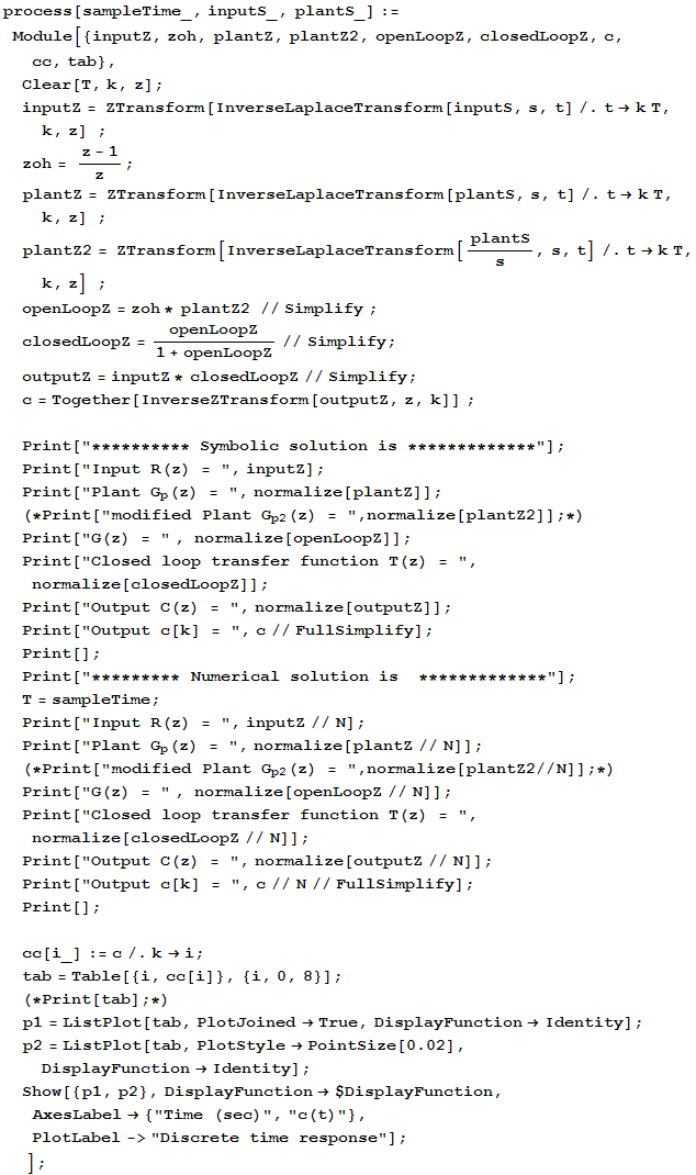This is a simple Mathematica script which takes as input the reference signal R(s), the plant transfer function G(s), and the sample time T, and generate the sampled output c[kT]. The intermediate computation of G(z) and the closed loop transfer function T(z) and C(z) and c[KT] are all shown both in symbolic format and in numerical format.