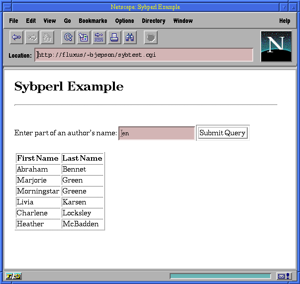 Sybperl Example]; print $query->startform; print qq[Enter part of an author's name: ]; print $query->textfield( -name => 'query_name' ); print $query->submit; # End the form. # print $query->endform; # If the user entered an author name, find all authors # whose first and/or last names match the value. # if ($query->param('query_name')) { # Use the pubs database. # $dbh->ct_sql("use pubs"); # Get the value the user typed # $query_name = $query->param('query_name'); # Find all of the matching authors. This search # is case-sensitive. # my $sql = qq[SELECT au_fname, au_lname ] . qq[FROM authors ] . qq[WHERE au_fname LIKE '%$query_name%' ] . qq[OR au_lname LIKE '%$query_name%' ] . qq[ORDER BY au_lname, au_fname]; my @rows = $dbh->ct_sql($sql); # Iterate over each row and display the first # and last name in separate table cells. # print qq[