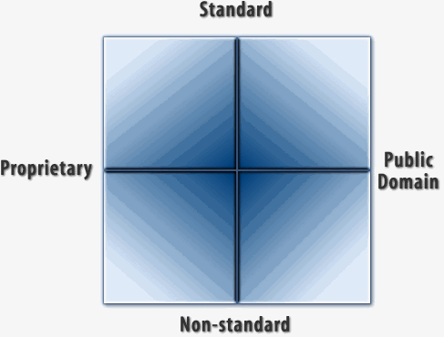 Countless de rigeur standards have been spectacularly wrong. "The world is flat." "The world is the center of the universe." "Precise latitude is impossible to calculate without a viewable landmark." "Manned flight is impossible." "You'll never need more than 640k of memory in your PC." One de rigeur standard we need to change right now says "proprietary means closed." In fact, proprietary is just one among several choices. Here is how they look on a matrix: